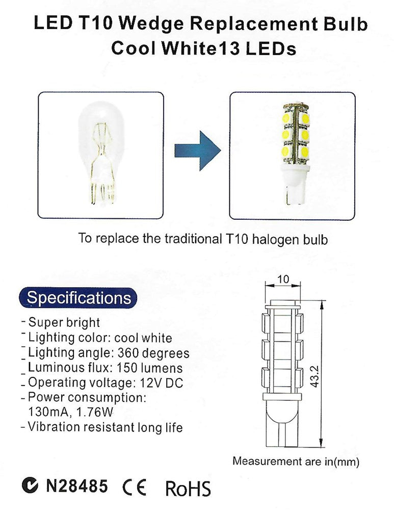 LED T10 Wedge replacement bulb. 13 super bright LED's. Cool white. 12 volt dc. 150 lumens. Vibration proof design.